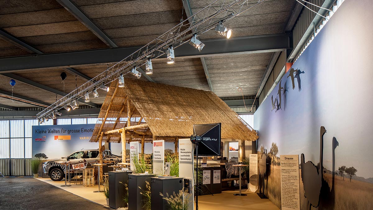 „Kleine Welten für grosse Emotionen“ – dieser Slogan war das Ziel eines Gemeinschaftsprojekts, um den Wünschen unseres Kunden näherzukommen um das Zielpublikum daran zu erinnern, dass ein Auftritt einer Firma zu einem emotionalen Erlebnis werden kann. Wir haben eine Savannenszenerie mit Tieren, Pflanzen, vielen kleinen Extras und einem majestätischen Hintergrund erschaffen. Hauptaugenmerk war aber die komplett aus Holz konstruierte Hütte, die im Zentrum des Geschehens thronte. Sie erinnert an die Einfachheit der Natur und erzeugte eine besonders charmante Atmosphäre und lud zum Gespräch ein.