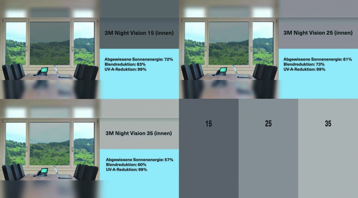 3M Sonnenschutzfilm Night Vision Serie wurde für Applikationen auf der Innenseite von Glasscheiben entwickelt. Einfallende Wärmestrahlen werden im Gegensatz zu herkömmlichen Sonnenschutzeinrichtungen von dem Film absorbiert und reflektiert. Die gleichmässige Streuung der Sonnenstrahlen führt zu einer drastischen Reduzierung von Blendeffekten. Zudem werden schädliche UV-A-Strahlen, die Hauptursache von Bleichschäden, zum größten Teil reduziert. 3M Night Vision Sonnenschutzfilme verfügen über eine äusserst geringe Reflexion nach aussen sowie nach innen.