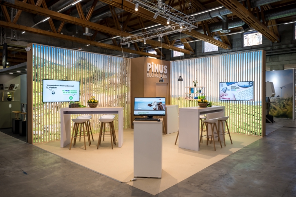 Mit viel Holz und hinterleuchteten Bildern überzeugte der Messestand von PINUS Buchhaltung an der Messe Tier + Technik.