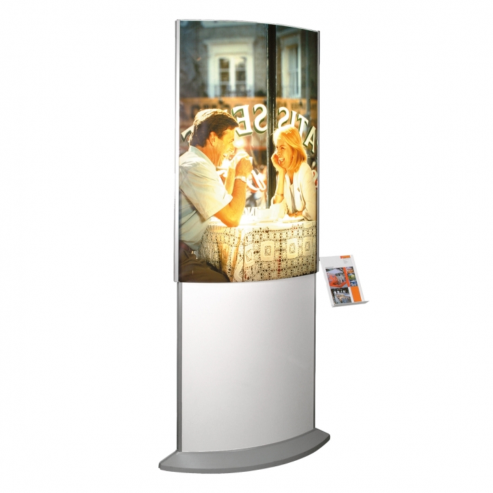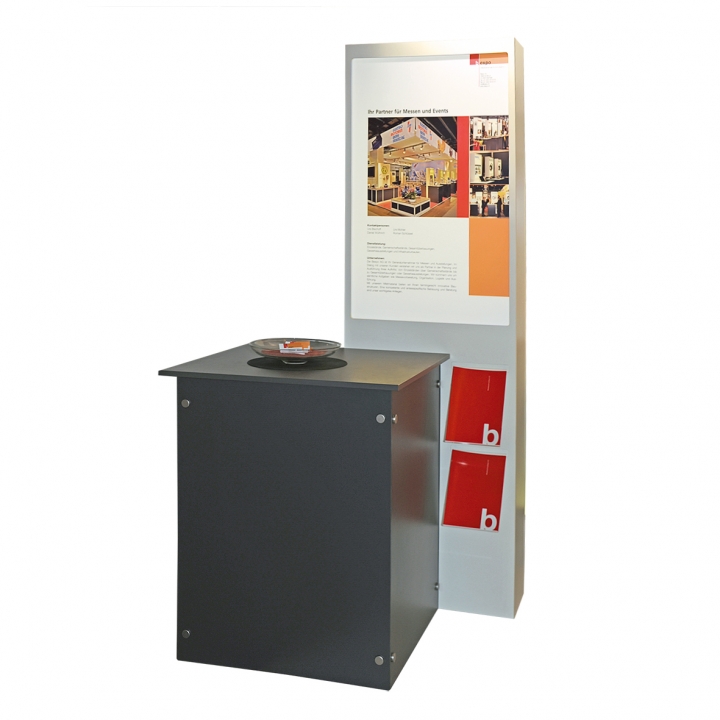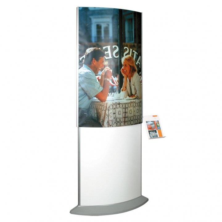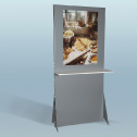 Nr. 9861 / Pylone mit Alurahmen 99.2 x 198.4 cm, beidseitig Füllung weiss oder lichtgrau, zwei Standfüsse und Beleuchtungselement, 1 Tablar inkl. Konsolen, exkl. Grafik