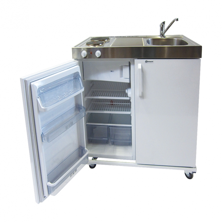 Nr. 6058 / Küchenkombination mit Spühlbecken mit Mischbatterie und Durchlauferhitzer für Warmwasser, Kühlschrank und 2 Herdplatten.