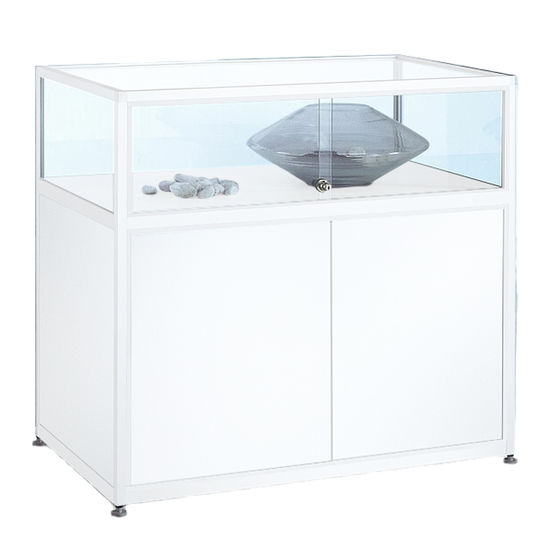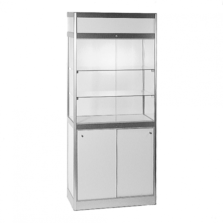 Nr. 6040 / Standvitrine aus System weiss, 50 x 100 x 250 cm, Glashöhe 100 cm, Glasschiebetüren abschliessbar, Korpusschiebetüren abschliessbar, 2 Glastablare, 2 Korpustablare, inkl Vitrinenbeleuchtung